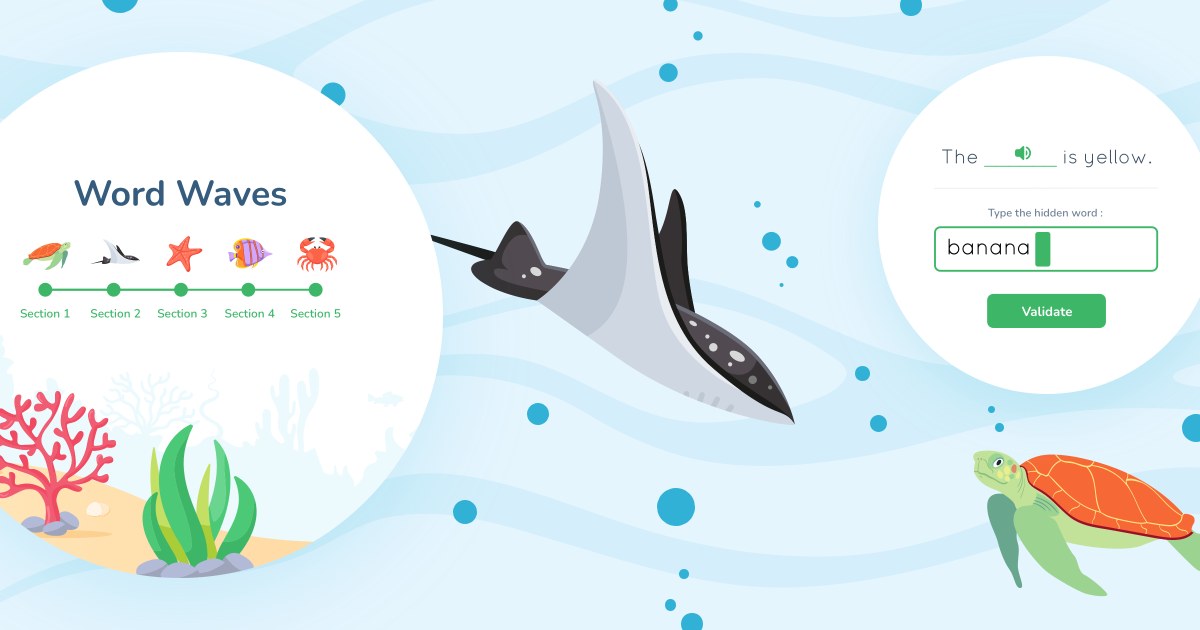 Up until now, students were accustomed to typing characters displayed on the screen. Starting with Word Waves, they get to try their hand at typing a word spoken aloud without seeing it. Don’t worry, we’re not about to throw students into the deep end! Let’s take the plunge and find out how it all works. 🏊