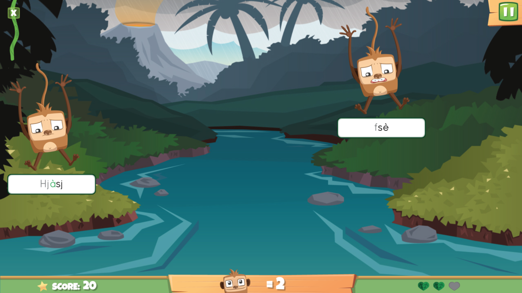Scénario : Une violente tempête fait rage dans la forêt. Emportés par les bourrasques, les singes chutent dans la rivière. Seule une liane propulsée par des caractères bien tapés pourra les ramener à l’abri.