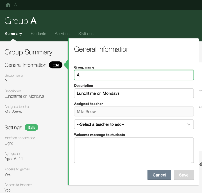 Select the one that corresponds to your group: ages 6–11, ages 12–16, ages 17 and older. It determines the appearance of the student interface (characters, animations, etc.), the length of texts and the difficulty of activities. - Allow students to change their passwords