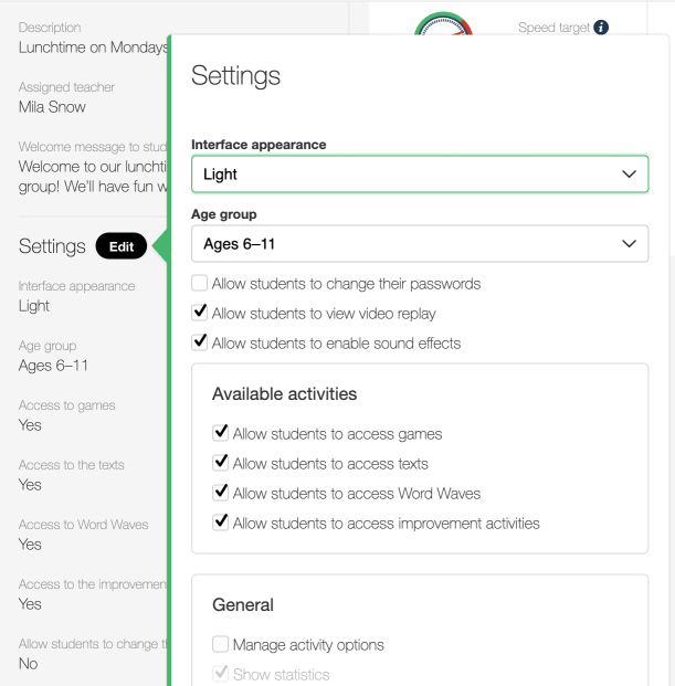 Check the boxes to enable your students to change their password and speed target. - Assigned teacher