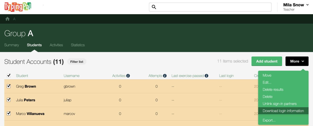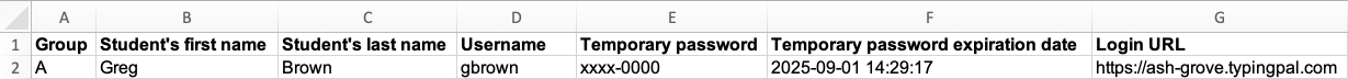 Whichever option you choose, we recommend that you provide students with a temporary password generated by Typing Pal. Passwords currently in use cannot be downloaded for security reasons.