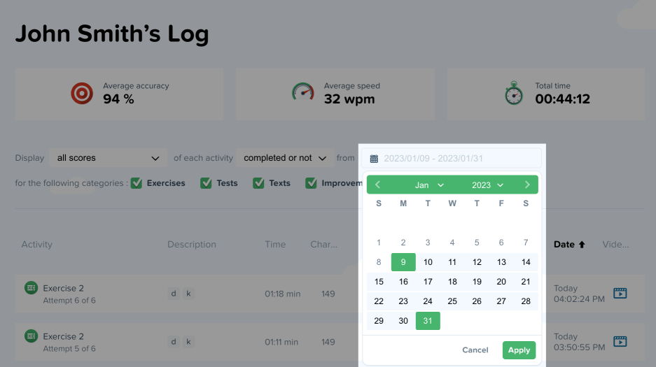 It can provide a more recent picture of a student’s progress, for example. Say a student has been touch typing for several months: the averages displayed are calculated for their entire training period. However, it’s likely their latest results are much better than those they achieved when they first started out. Using the filter to display only activities completed recently will also update the averages displayed for speed and accuracy—higher scores are much more encouraging!