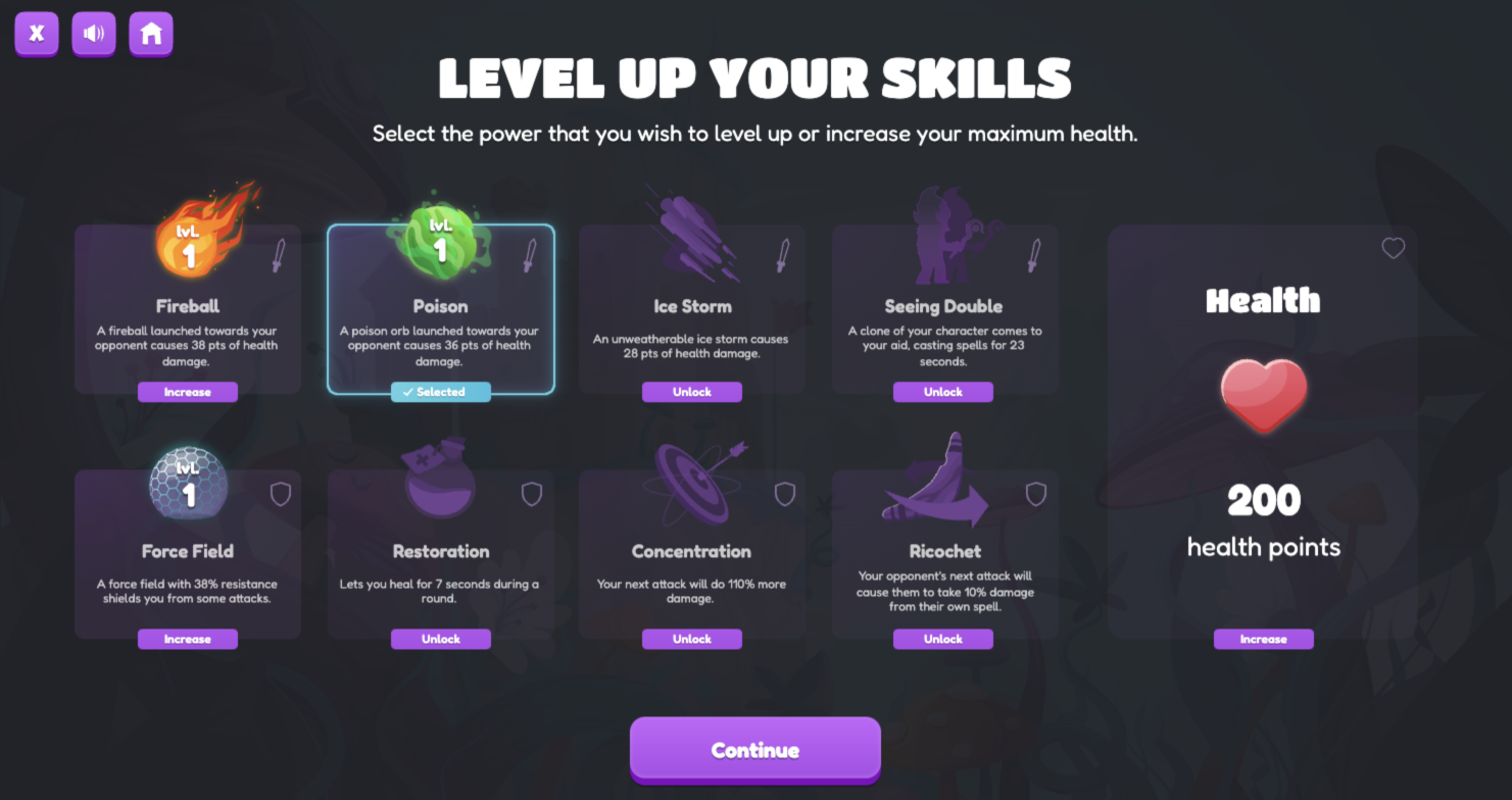 Students practice using the entire keyboard to type and cast eight different kinds of spells. They can choose one spell type to level up at the end of each round, after they’ve defeated their opponent. They must be strategic in their spellcasting, though. As spells increase in power, they also become longer to type!