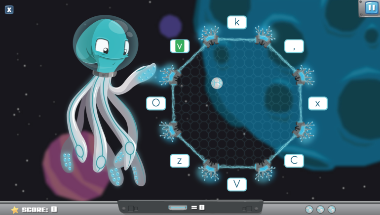Scenario: A cosmic ball on the verge of explosion threatens the galaxy. A space octopus is tasked with keeping the ball captive with its pulsing laser tentacles. Typing the right character activates the shield and stops the ball.