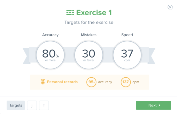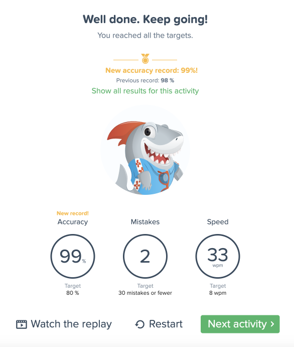 Every time a new activity is completed, it’s compared to personal bests in speed and accuracy.