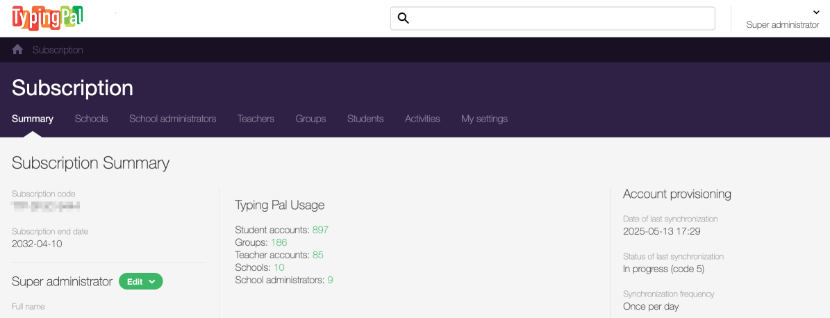 - The super administrator’s account is the only one that cannot be managed in ClassLink. The super administrator must use the subscription URL to log in to Typing Pal.