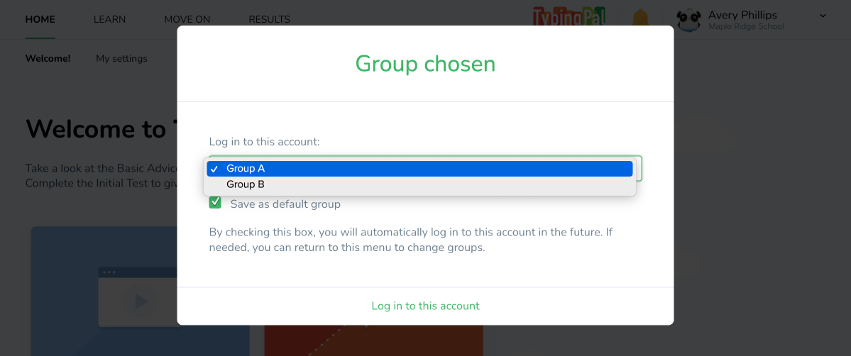 If students are part of multiple groups, you can set their default group yourself. This will make it easier for them to log in for the first time and in the future. You can set their default group in Typing Pal’s management interface.