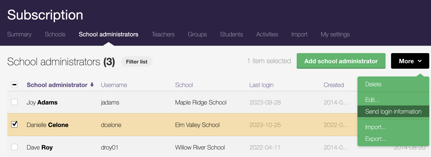 - Click the School administrators tab, and check off the administrators in the list to whom you want to send login information.