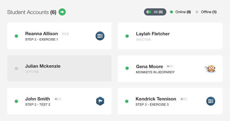 Tiles are displayed for all student accounts by default. Click Online or Offline in the top right corner of the panel to filter them by status.