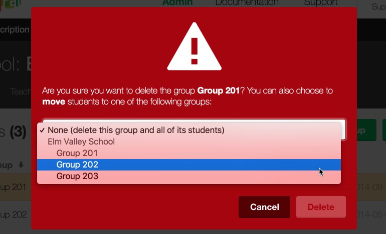 If a group being deleted contains student accounts, a pop-up window will offer you the choice of deleting those accounts or moving them to another group. Select the appropriate option, then click Delete to remove the group.