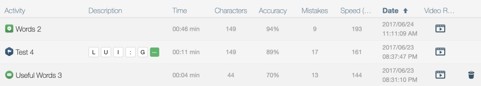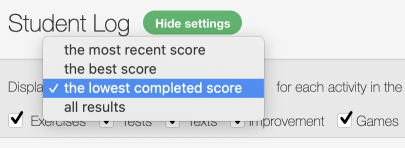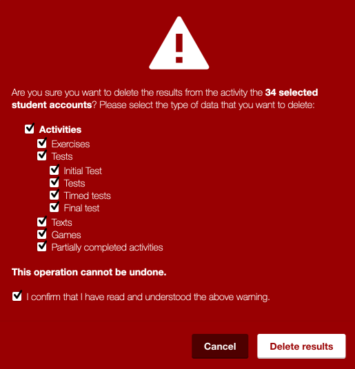 Delete results of all activities or just those of specific categories. Students can then start the activities again with a clean slate.