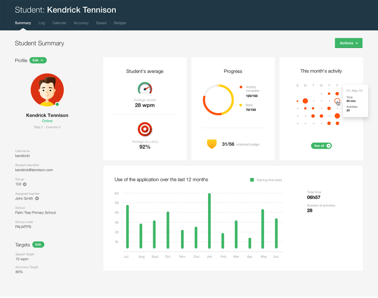 Students who practice regularly throughout the year will improve their typing skills more quickly than those who do not. The Student Summary screen lets you review the consistency of a student’s engagement with the program, as well as their average performance and progression through the training activities.