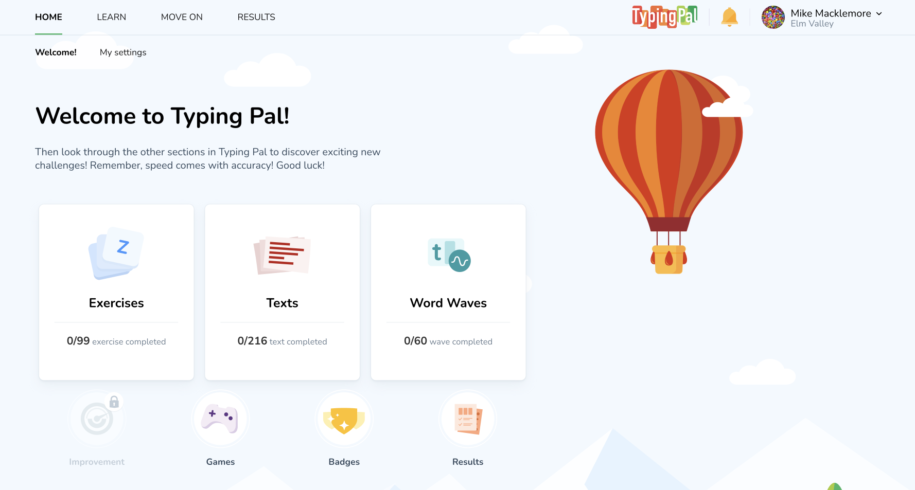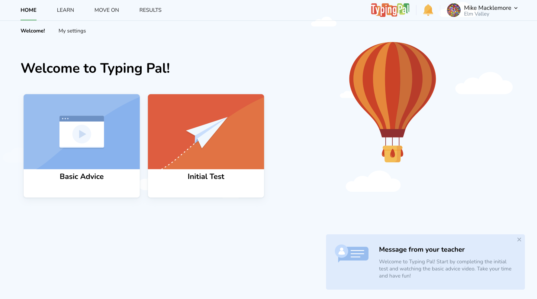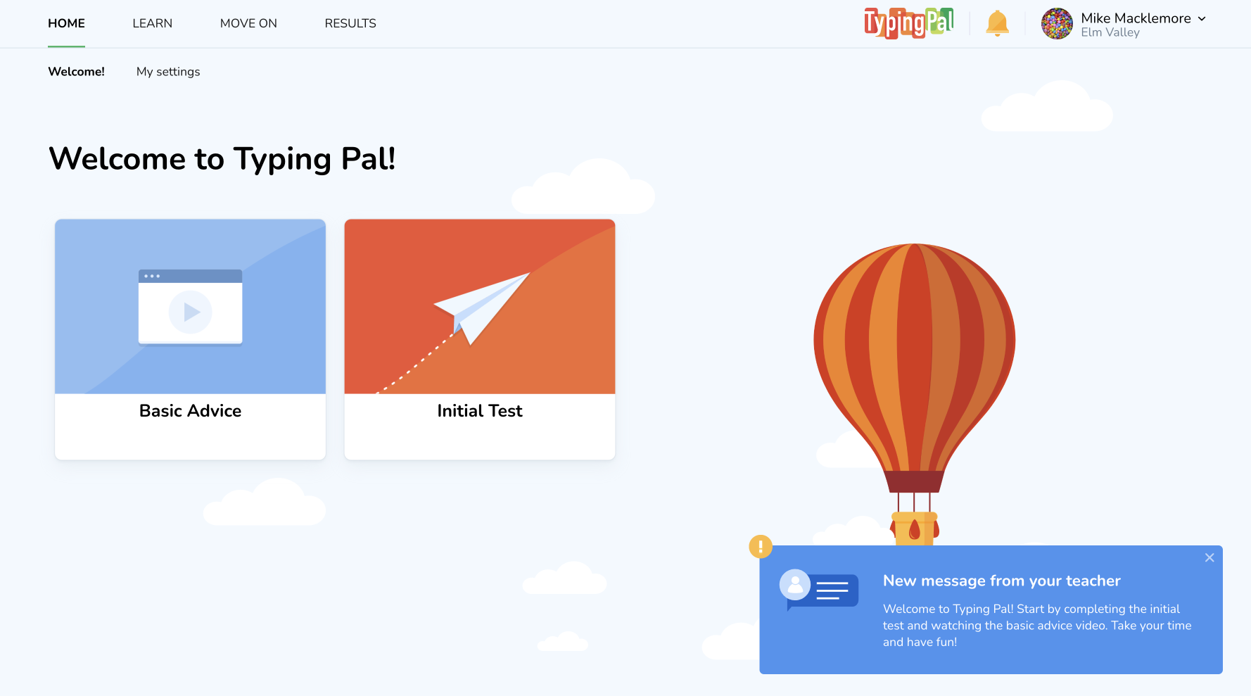 When students log in, Typing Pal welcomes them with two suggested activity tiles and the teacher’s message to the group if there is one.