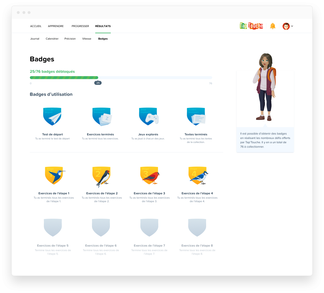 Qui n’aime pas collectionner des badges? Ça tombe bien, Tap’Touche en propose des dizaines! Répartis en quatre catégories, ils témoignent autant des progrès effectués que des exploits accomplis. C’est une façon amusante et efficace de se fixer de nouveaux objectifs à la maison ou de raviver l’intérêt des élèves à l’école.