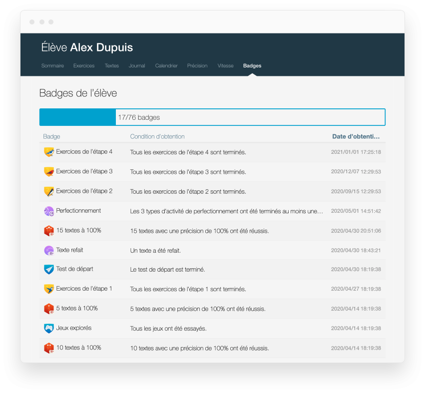 Au-delà de la motivation, tous ces badges donnent aussi une perspective différente sur le progrès et les réalisations des élèves. Une riche collection témoigne de leur persévérance et de leur assiduité au travail. Ces trophées virtuels complètent donc à merveille les statistiques de performance dans les évaluations ou les rapports d’utilisation à l’intention des parents.