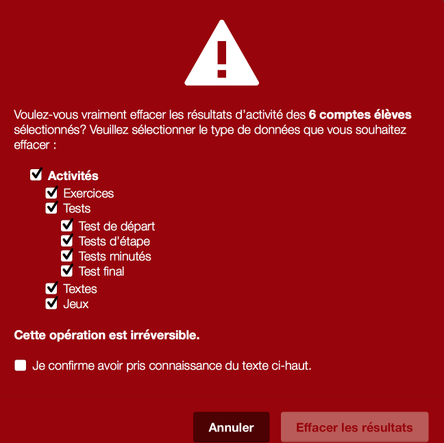 Ce pourrait être le cas, par exemple, si vous voulez effacer le résultat de quelques activités avant de demander aux élèves de les recommencer ou encore si vous décidez de réinitialiser le test final afin de le refaire passer à vos élèves dans un environnement scolaire supervisé.