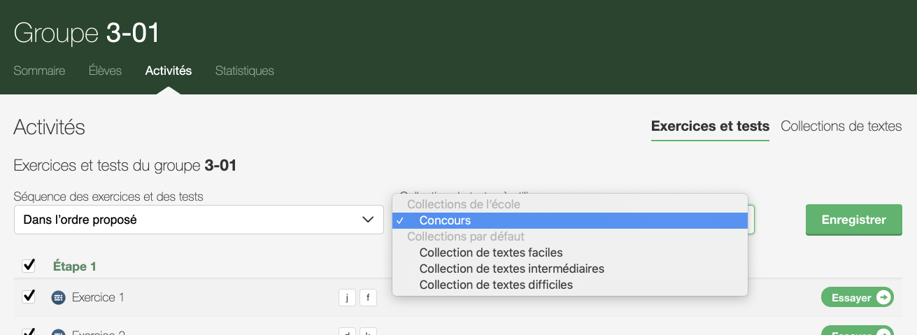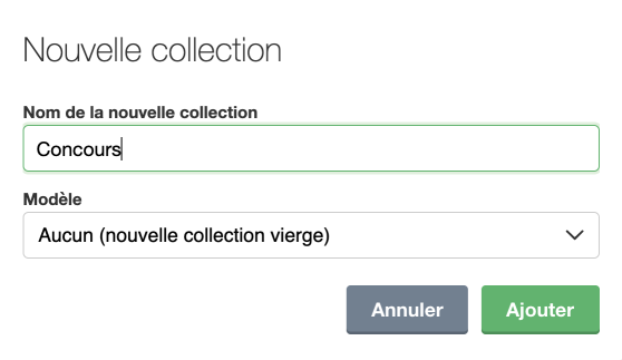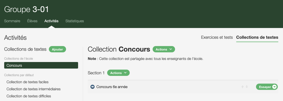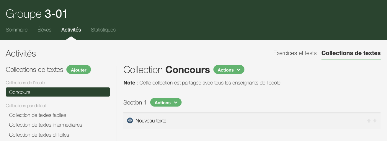 Note — Ajoutez un seul texte par collection pour vous assurer que les élèves n’ont accès qu’à celui-ci lors du concours. Si vous avez des textes différents selon les niveaux scolaires, nous vous recommandons de créer autant de collections.