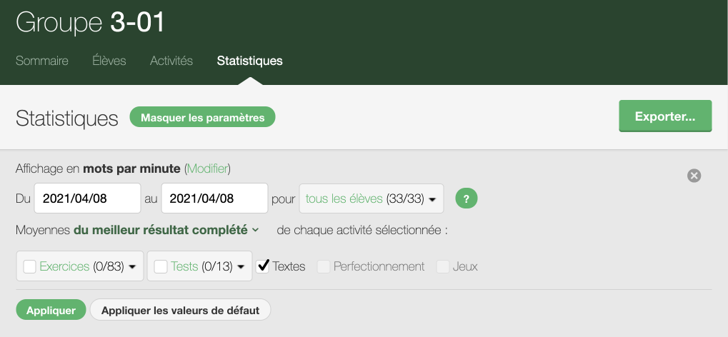 Dans la gestion du groupe, sélectionnez l’onglet Statistiques (A). Entrez la date de la tenue du concours dans les deux champs, pour n’obtenir que les résultats de cette journée. Sélectionnez les Moyennes du meilleur résultat complété et décochez toutes les activités sauf Textes. Cliquez sur Appliquer (B), puis sur le bouton Exporter (C).