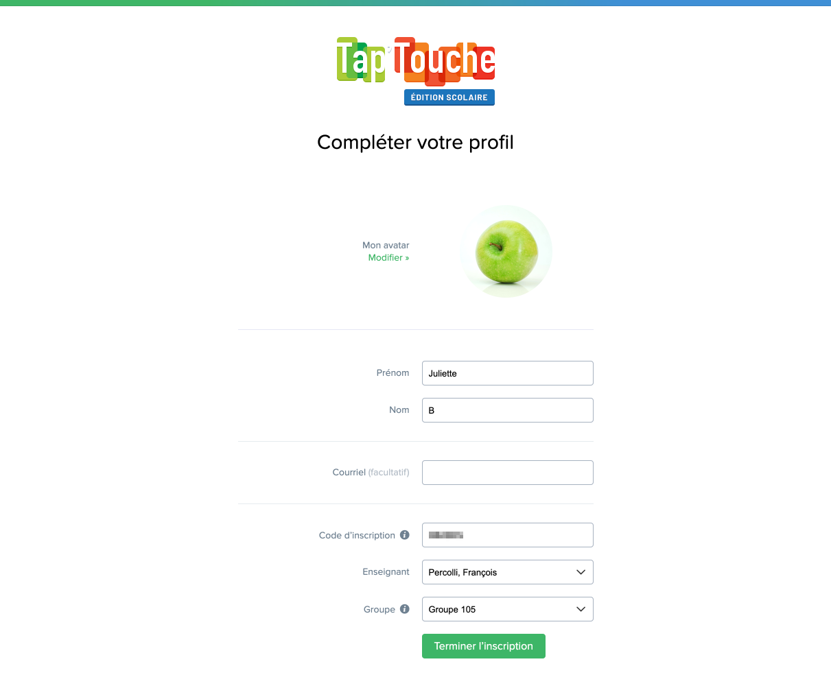 - Dans le formulaire suivant, demandez à vos élèves de remplir les champs. Donnez-leur le code d’inscription, et précisez aussi qui est leur enseignant ou enseignante (vous!) et quel est leur groupe. Il ne reste plus qu’à cliquer sur le bouton Terminer l’inscription.
