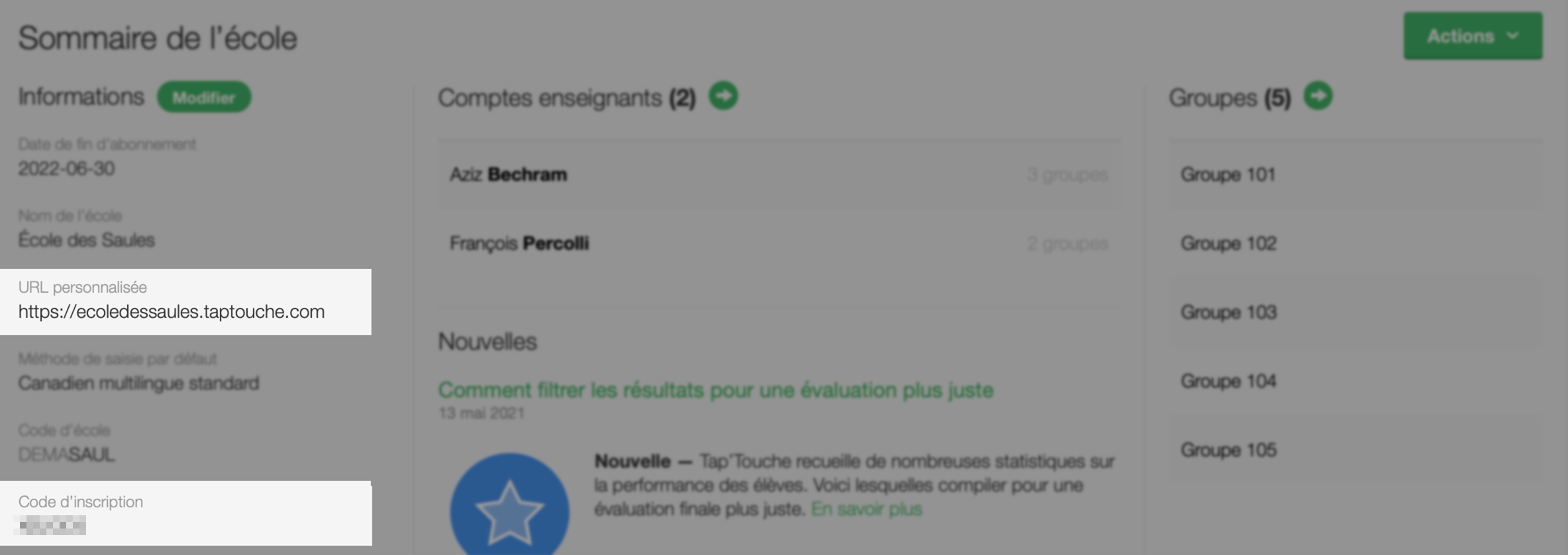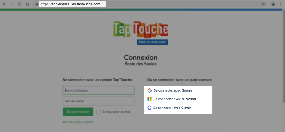 - l’URL personnalisée de votre école pour accéder à Tap’Touche;