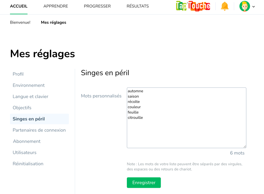 Ajoutez vos mots à partir des réglages du jeu Singes en péril.