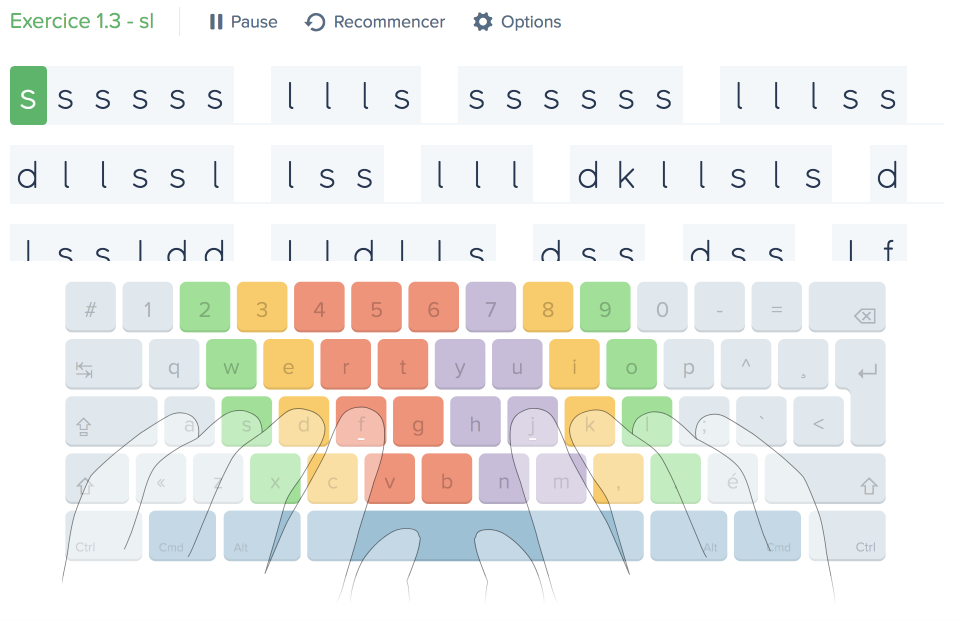 Les animations humoristiques changent en fonction de la frappe, des erreurs et du résultat final. | Lorsqu’une erreur est détectée, les doigts apparaissent au-dessus du clavier afin de montrer le doigt à utiliser pour taper la bonne touche. |