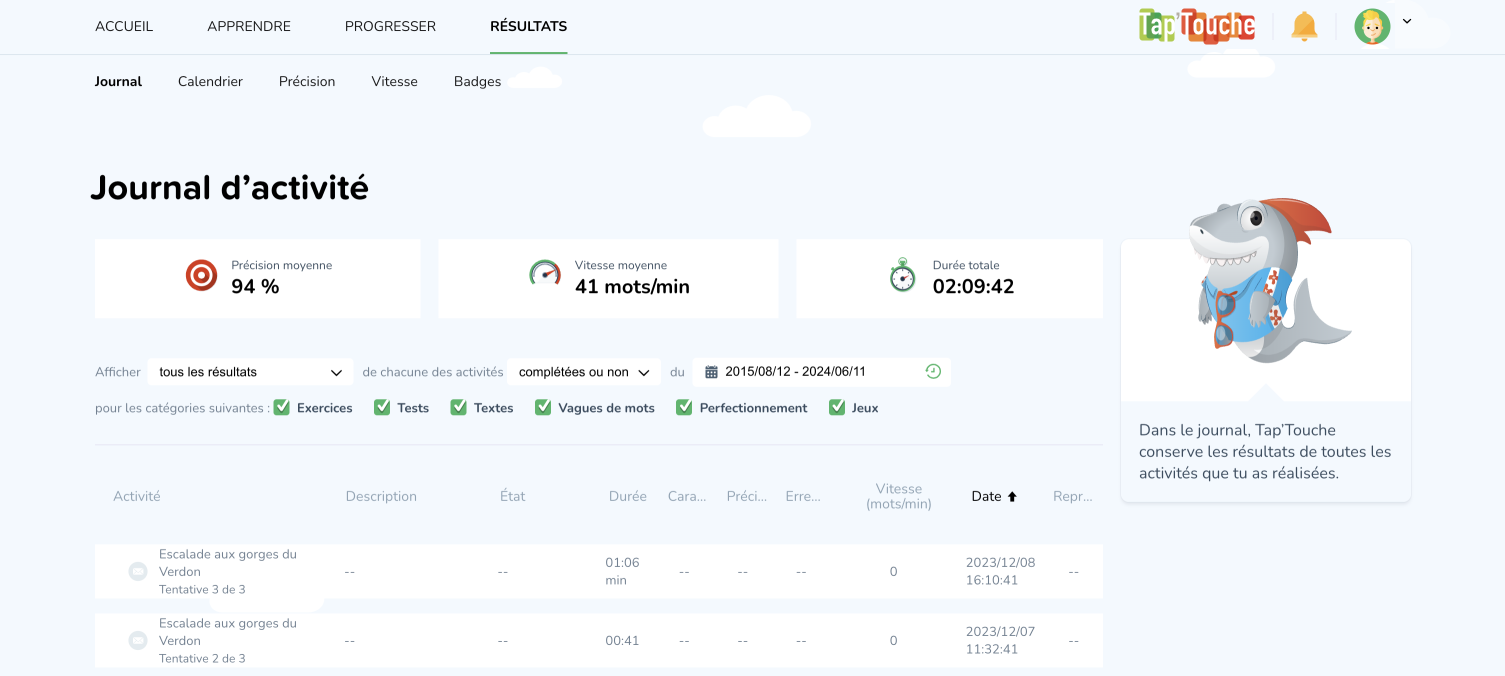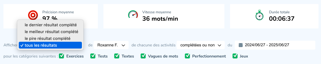 Filtrez vos résultats en cochant ou décochant les cases Exercices, Tests, Textes, Vagues de mots, Perfectionnement et Jeux, et en sélectionnant les activités complétées seulement ou toutes les activités, complétées ou non. Vous pouvez choisir une période précise avec le filtre par dates.