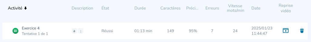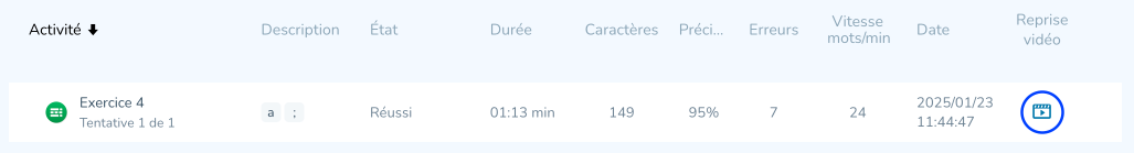 La vitesse et la précision donnent une idée du niveau d’habileté, mais ces statistiques ne permettent pas toujours d’en apprécier les subtilités. Vous pourriez bonifier votre analyse grâce aux reprises vidéos disponibles dans votre journal d’activité. Il vous suffit de cliquer sur l’icône de vidéo à droite d’une activité listée.
