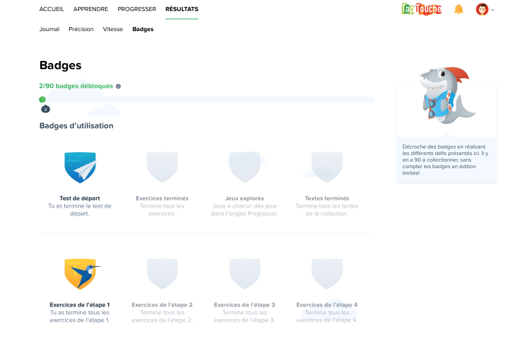 Assurez-vous de collectionner tous les badges en réussissant toutes les activités et en explorant tout ce que Tap’Touche a à vous offrir. Accédez à votre collection en cliquant sur le lien Badges depuis l’onglet Résultats.