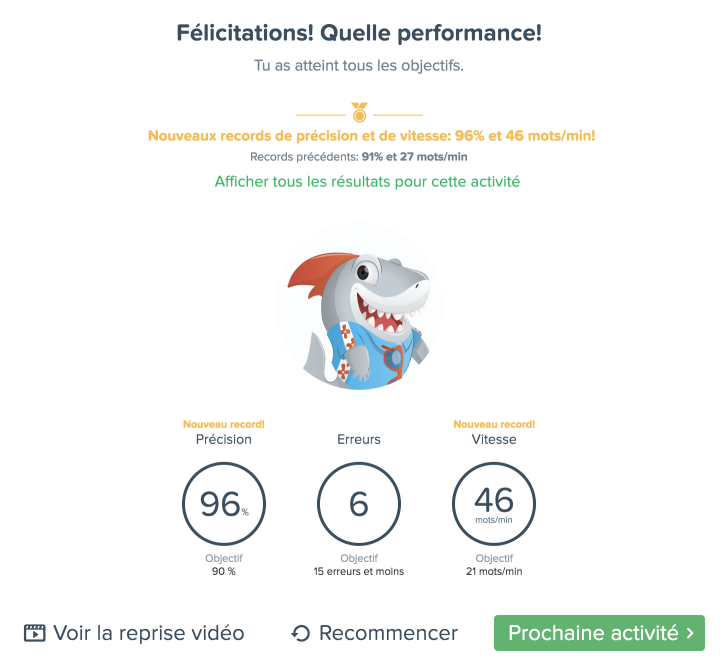 Les badges de performance vous encouragent à vous dépasser et à atteindre de hauts niveaux de maitrise de la frappe au clavier.