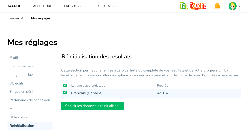 - Sélectionnez la langue d’apprentissage associée aux résultats que vous voulez réinitialiser, puis cliquez sur le bouton Choisir les données à réinitialiser...