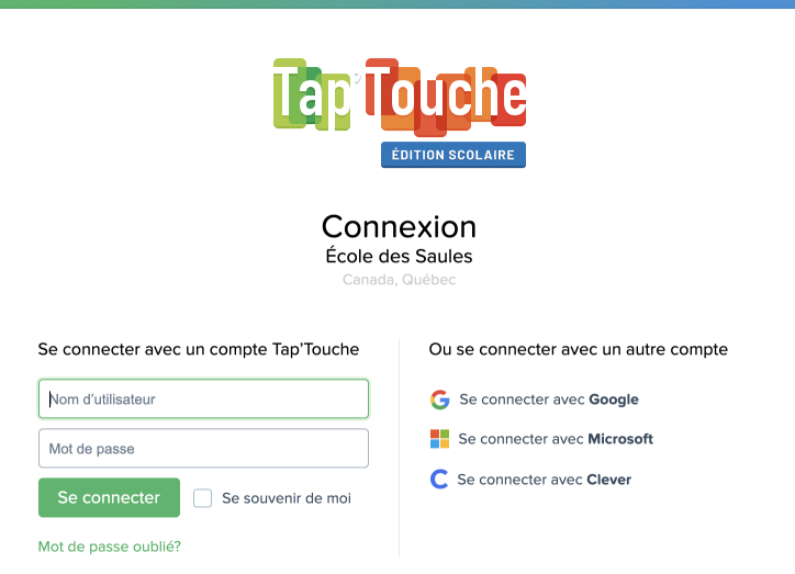 - Les administrateurs d’école, les enseignants et les élèves qui ont déjà un compte Tap’Touche devront s’authentifier avec leur Nom d’utilisateur et leur Mot de passe, puis cliquez sur le bouton Associer.