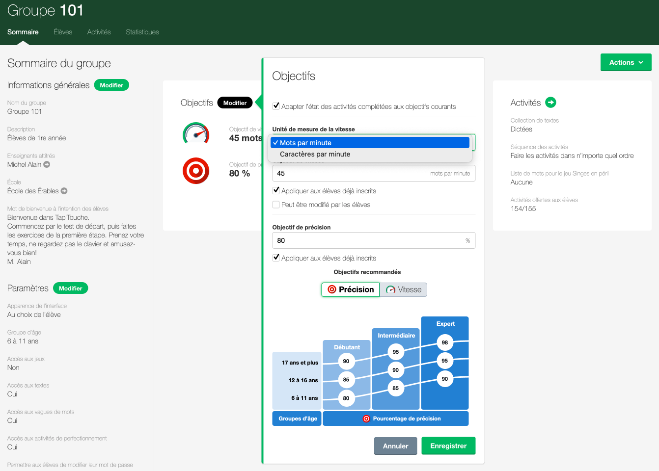 Note — L’objectif de vitesse représente la vitesse de frappe que les élèves devraient atteindre à la fin de leur formation. Tap’Touche va automatiquement ajuster la cible à atteindre pour chacun des exercices, afin de proposer aux élèves un défi raisonnable tout au long de leur apprentissage.