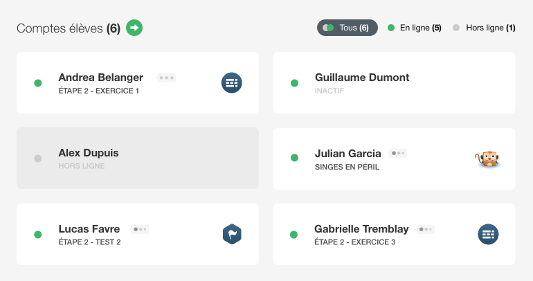 Chaque tuile représente le compte d’un élève et affiche son statut (En ligne ou Hors ligne) ainsi que l’activité en cours de réalisation, le cas échéant.