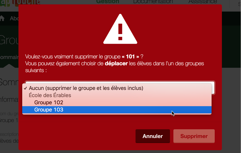 Si le groupe qui est supprimé contient des comptes élèves, une fenêtre apparait et vous offre de les supprimer ou de les déplacer dans un autre groupe. Sélectionnez l’option qui vous convient, puis appuyez sur Supprimer pour supprimer le groupe.