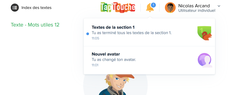 Les badges d’utilisation encouragent les élèves à réaliser toutes les activités. Les badges liés aux textes sont exclusifs aux trois collections de textes par défaut.