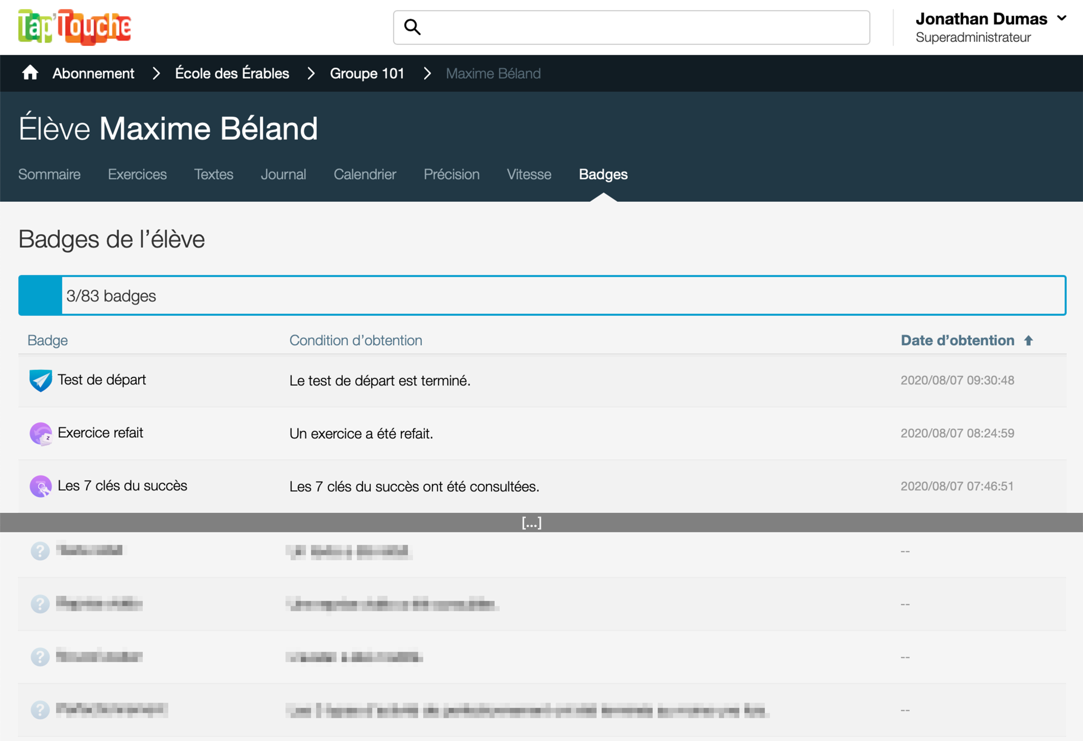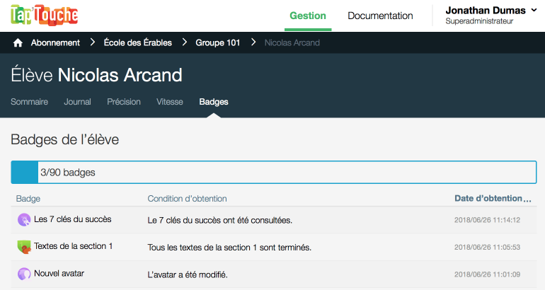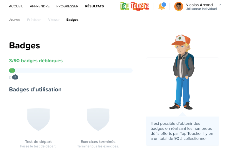 Les badges de performance encouragent les élèves à se dépasser et à atteindre de hauts niveaux de maitrise de la frappe au clavier.